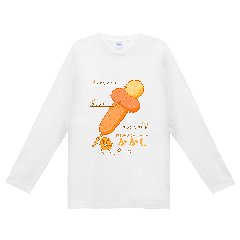 輪島市のソウルフードに定着した藤田総本店さんの「かかし」。 頭はうずらの卵、手は赤ウインナー、体はフランクフルトでできた揚げ物です。 昔から輪島市民の定番おかずのかかしがのとあつめに登場。 藤田さん定番のコロッケも一緒にいるよ。 肌寒い季節のお供に…長袖Tシャツです。 ※利益は全額被災地へ寄付いたします ※二次販売歓迎!ぜひご相談ください♬ ※藤田総本店様ご了承済みです