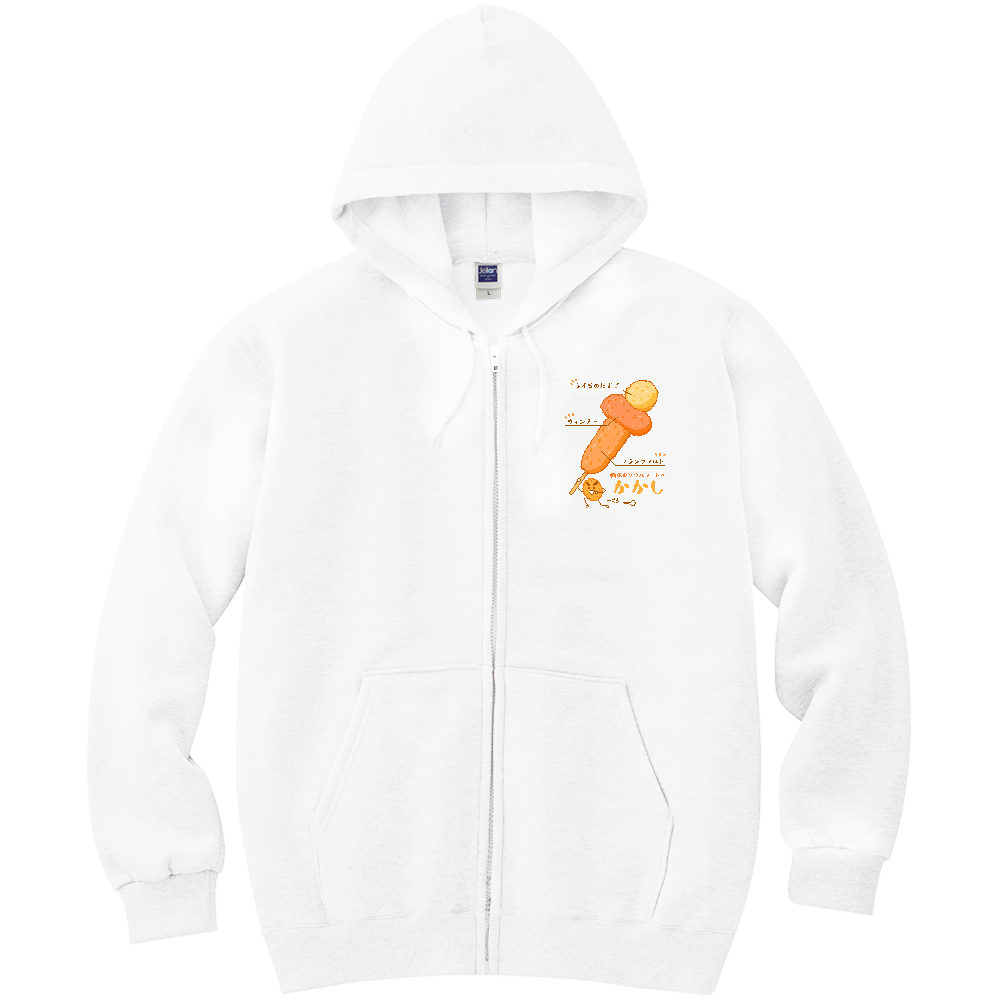 輪島市のソウルフードに定着した藤田総本店さんの「かかし」。 頭はうずらの卵、手は赤ウインナー、体はフランクフルトでできた揚げ物です。 昔から輪島市民の定番おかずのかかしがのとあつめに登場。 藤田さん定番のコロッケも一緒にいるよ。 こちらは軽量ジップアップパーカーです。別で定番タイプもございます。 ※利益は全額被災地へ寄付いたします ※二次販売歓迎!ぜひご相談ください♬ ※藤田総本店様ご了承済みです