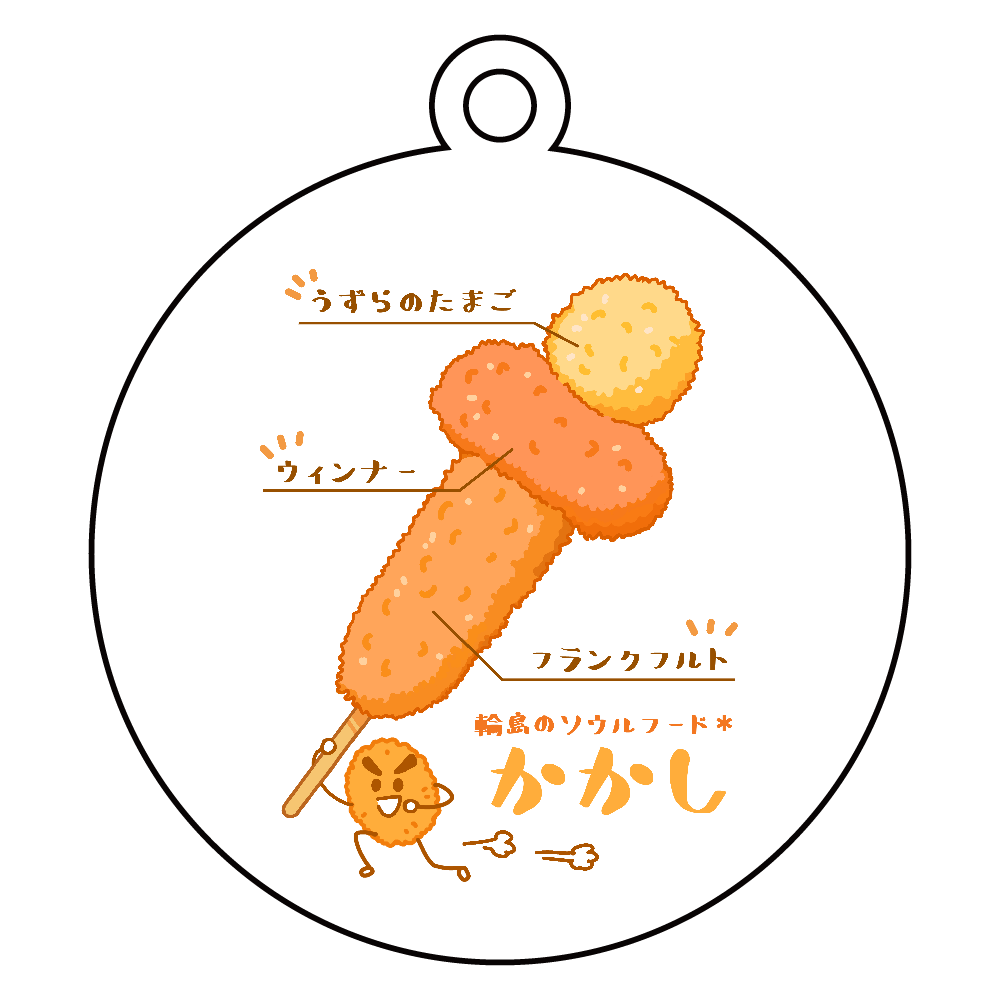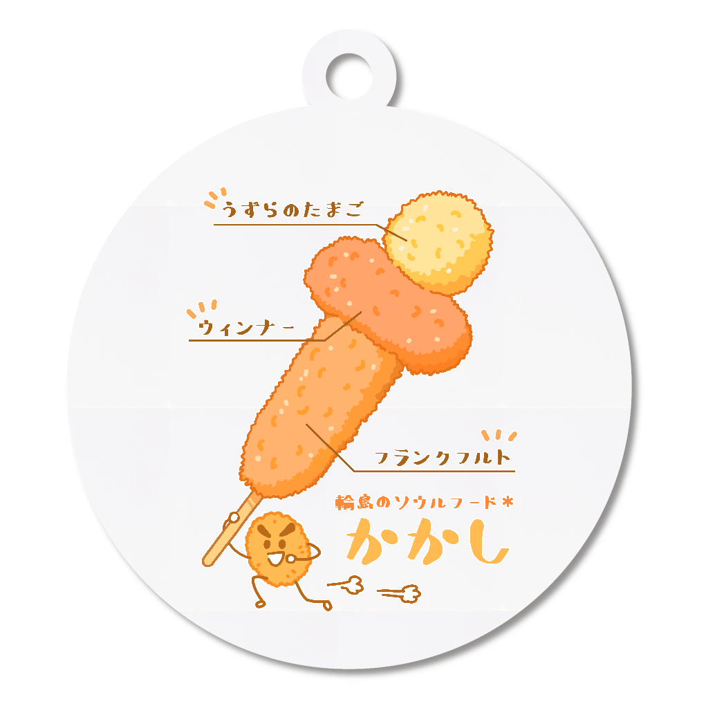 輪島市のソウルフードに定着した藤田総本店さんの「かかし」。 頭はうずらの卵、手は赤ウインナー、体はフランクフルトでできた揚げ物です。 昔から輪島市民の定番おかずのかかしがのとあつめに登場。 藤田さん定番のコロッケも一緒にいるよ。 こちらは丸形のアクリルキーホルダー(6cm)です。 カラー:クリア ※利益は全額被災地へ寄付いたします ※二次販売歓迎!ぜひご相談ください♬ ※藤田総本店様ご了承済みです