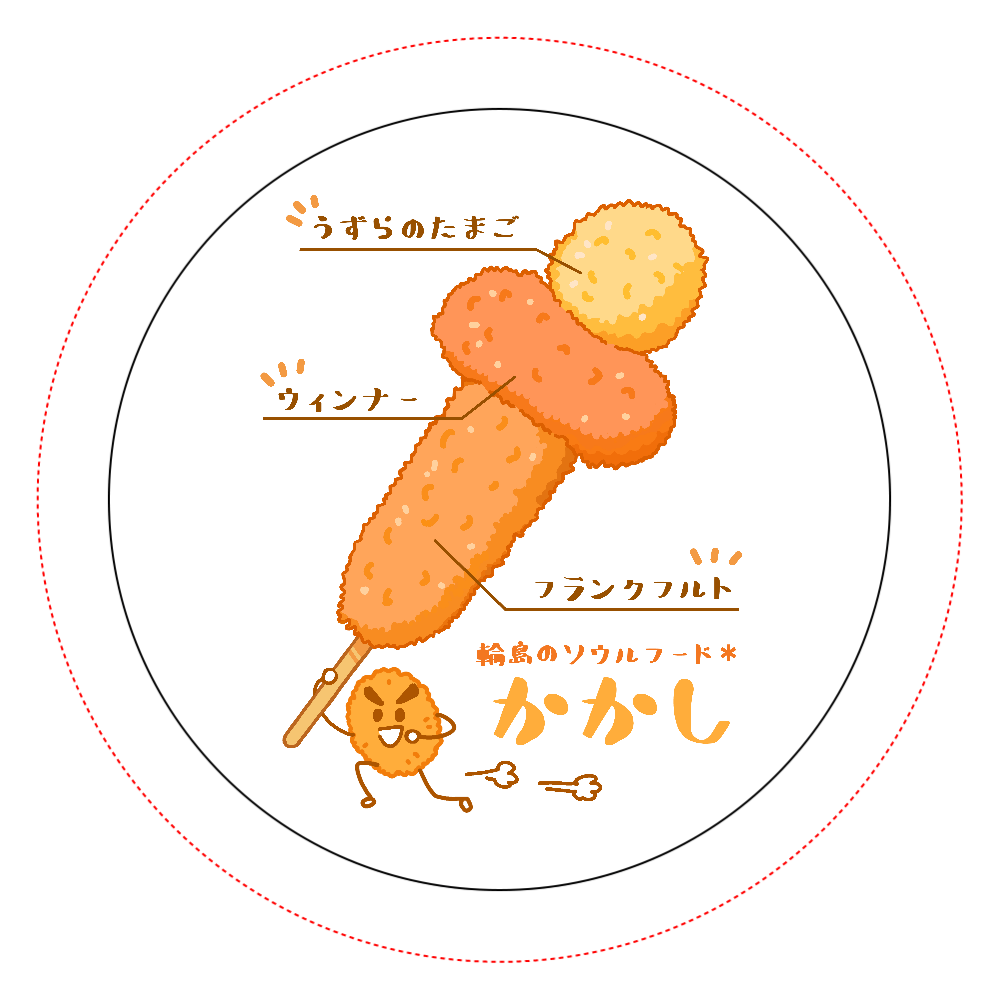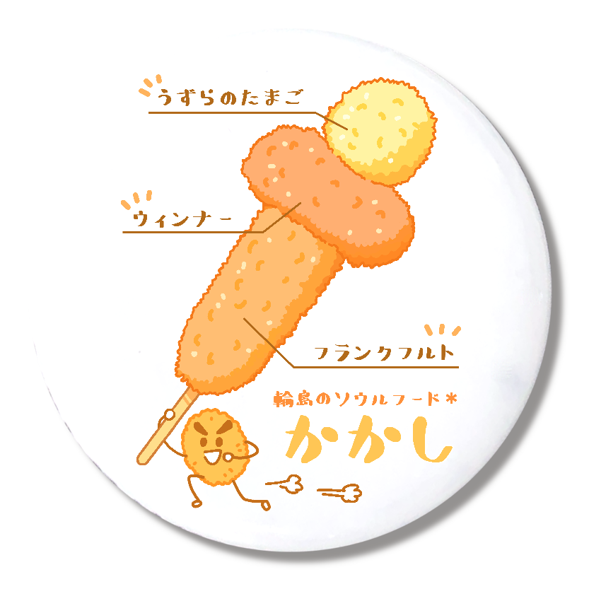 輪島市のソウルフードに定着した藤田総本店さんの「かかし」。 頭はうずらの卵、手は赤ウインナー、体はフランクフルトでできた揚げ物です。 昔から輪島市民の定番おかずのかかしがのとあつめに登場。 藤田さん定番のコロッケも一緒にいるよ。 さりげなく日常を彩る缶バッジです。 ※利益は全額被災地へ寄付いたします ※二次販売歓迎!ぜひご相談ください♬ ※藤田総本店様ご了承済みです