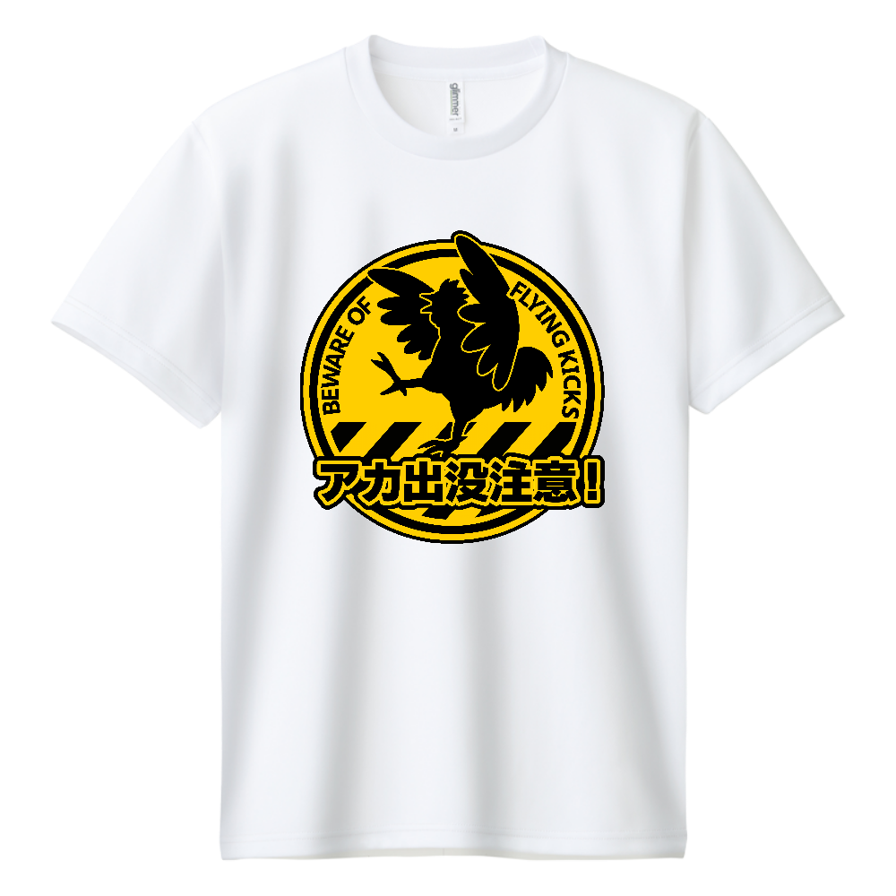 アカ出没注意!〇(ドライTシャツ/正面デザイン/白色)