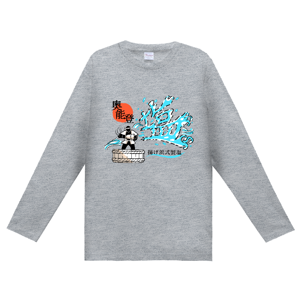 揚げ浜式製塩…それは石川県珠洲市で継承されてきた伝統技法。 桶で海水を汲み上げ、全て手作業作られる塩はまろやかで別格の美味しさです。 守りたい能登の伝統を胸に、食したい能登の塩を食卓に…。 肌寒い季節のお供に…長袖Tシャツです。 ※利益は全額被災地へ寄付いたします ※二次販売歓迎!ぜひご相談ください♬