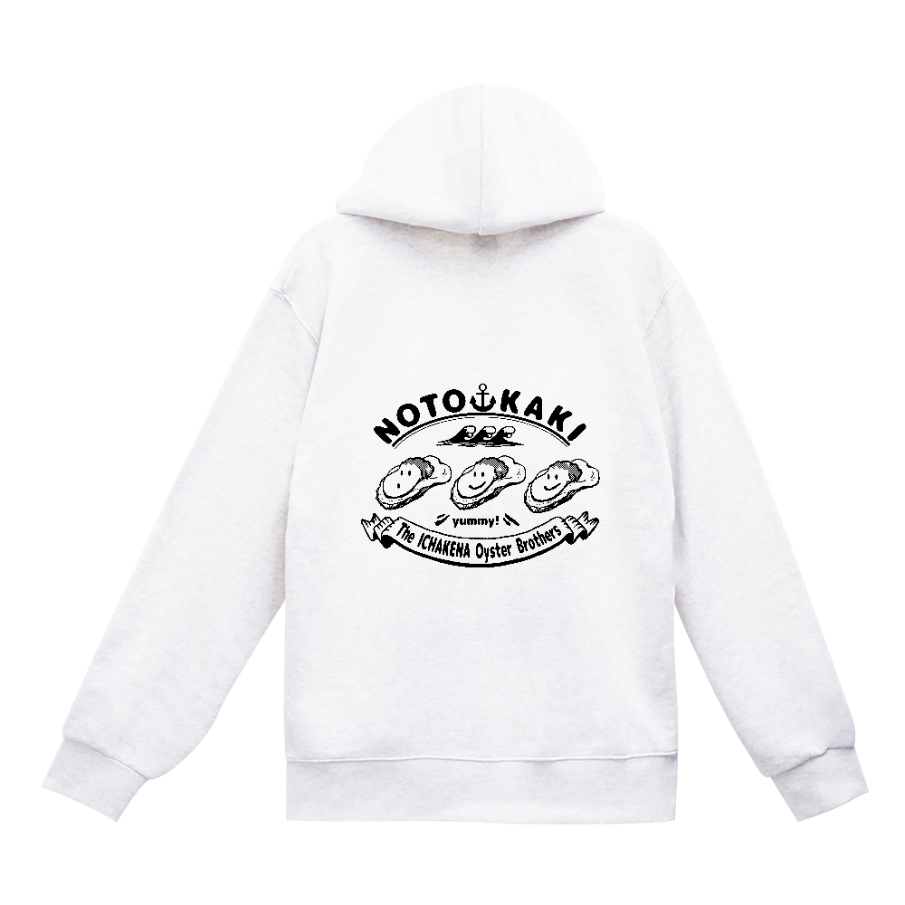 いちゃけな能登かき(定番ジップパーカー/背面デザイン/白色)